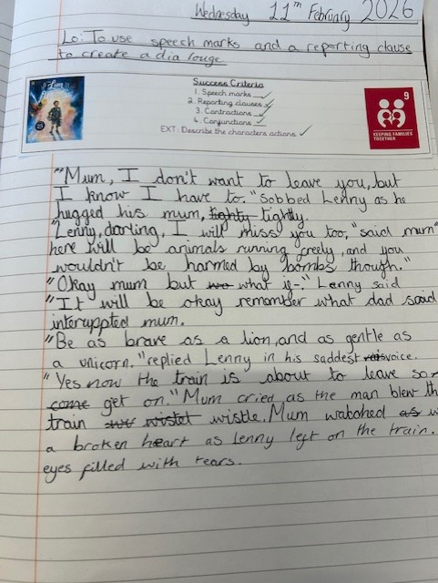 Following this activity, the class explored the emotional side of wartime childhoods by writing in character as Lenny, the main character from The Lion and the Unicorn. They wrote heartfelt letters to Lenny’s father, who had gone away to fight in the war. The children used emotive language to express feelings of fear, pride, confusion, and longing. Many included touching details about missing their father’s presence and hoping he was safe. The class then extended this by writing dialogue between Lenny and his mum before he was evacuated. They used inverted commas correctly to show speech, and explored the mixture of emotions both characters might be feeling—nervousness, reassurance, and the difficulty of saying goodbye.